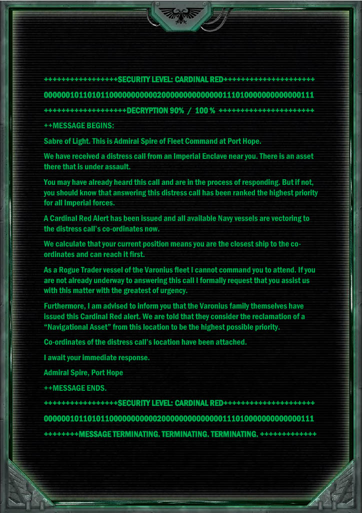 The Agents were given this handout while en-route to outermost ring of the Gilead System. It directed them to a previously unknown planet, designated Plinius, which was being invaded by Chaos forces.
